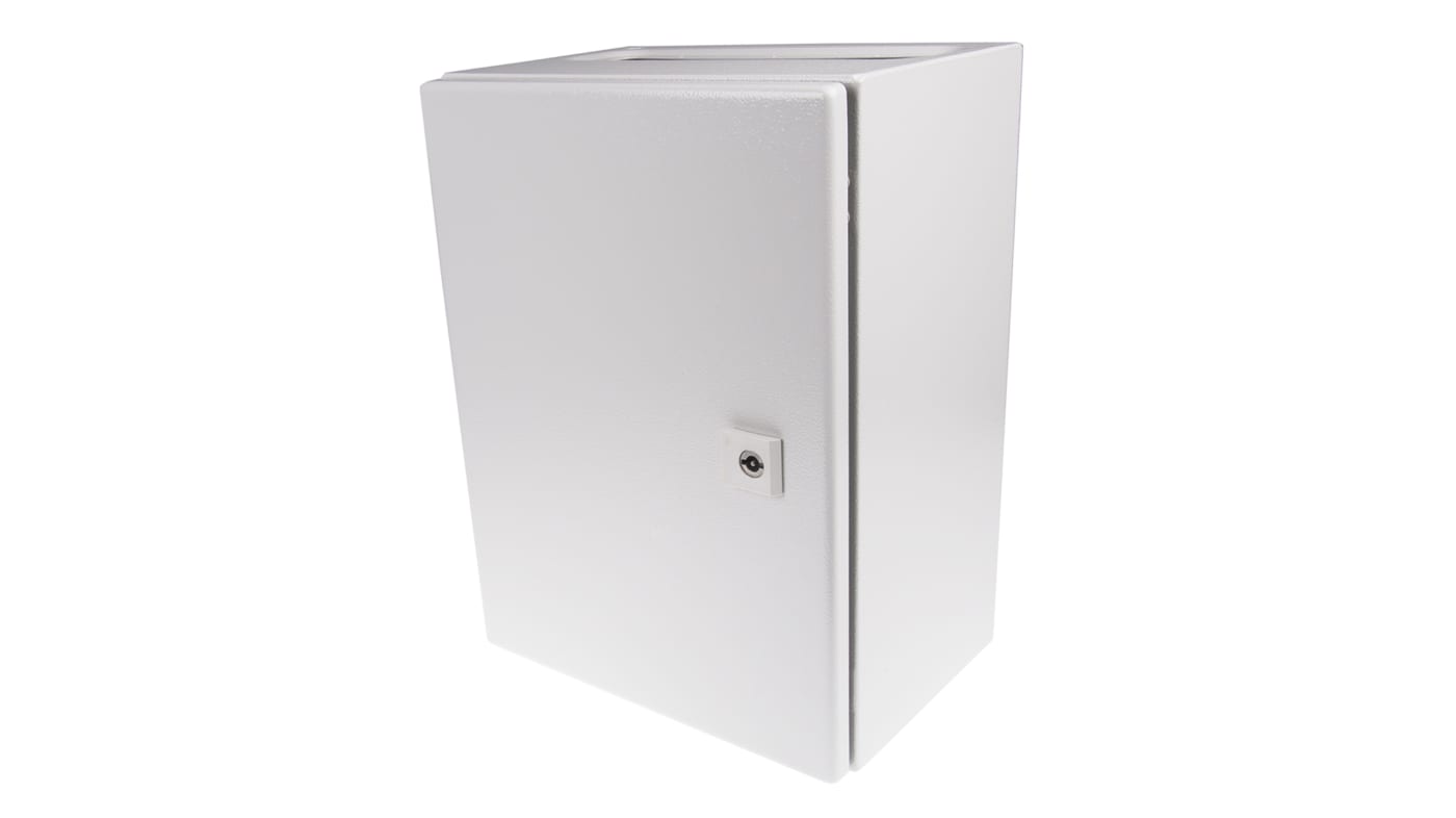 The AE series wall box from Rittal has a strong unibody construction which has been dipcoat-primed and powder coated in a textured light grey finish for added corrosion protection. The door is interchangeable allowing it to be mounted on either side of the enclosure and is fitted with 2 cam locks and a foam gasket. The enclosure is also supplied with a gland plate in the base and a zinc plated mounting plate.